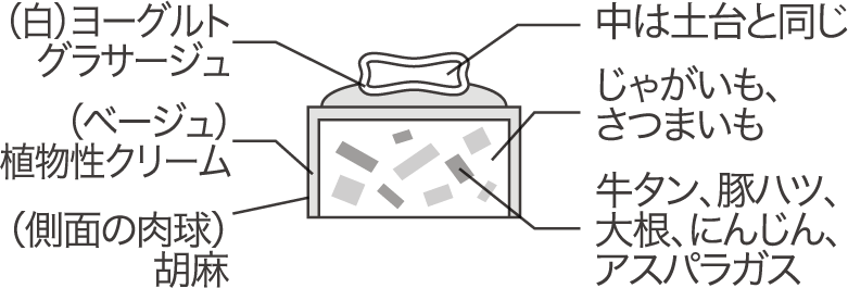 家族の一員である、わんちゃん専用のケーキを作りました。野菜のテリーヌをケーキ風に仕上げ、中には牛タン、豚ハツがたっぷり。わんちゃん大満足の一品です。