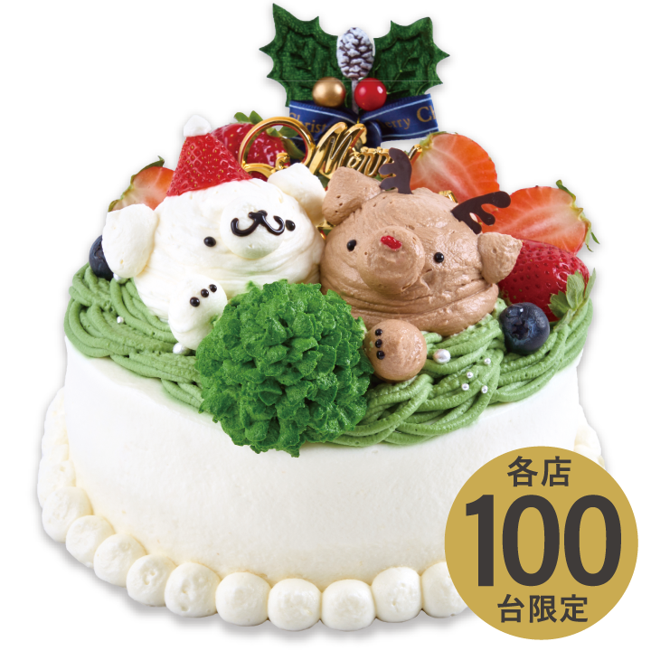 トナカイくんとくまちゃんサンタが、仲良くクリスマスの準備中…今年はどんなクリスマスになるかなぁ。生クリームとふわふわスポンジ好きには堪らないケーキです。